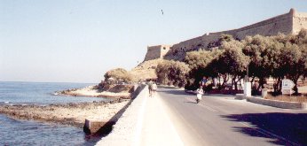 Heute stehen wir schon um 7:00 auf, denn wir wollen nach Rethymnon. Diese Stadt ist ein ganzes Stück von Stalida entfernt, so daß wir mit dem Bus 2 1/2 Stunden brauchen. Aber das macht uns gar nix, da die Straße am Rand des Ida-Gebirges ziemlich eindrucksvoll ist. Dort angekommen begeben wir uns auf den Weg vom etwas außerhalb gelegenen Busbahnhof zur Stadt. Dabei kommen wir am Fortezza, einer venezianischen Burg aus dem 19. Jahrhundert vorbei, in die wir auch gleich hineinstürmen. |
